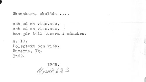 //// Skomakarn, skolåda ... //// och så en vissvass, och så en vissvass, han går till tösera i månsken. //// s. 10 ? //// v //// Polsktext och visa. Fuxerna, Vg. 3462. //// IFGH. //// ta 3 //// 1 ////