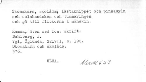 //// * //// Skomakarn, skolådar^ lästaknippet och pinnasyln och sulahandsken och tummaringen och gå till flickorna i mänskin. //// Samsa, även med fon. skrift. Dahlberg, I. //// Vgl, Öglunda, 2219:1, s. 190. //// Skomakarn och skolåda. //// 376. ////