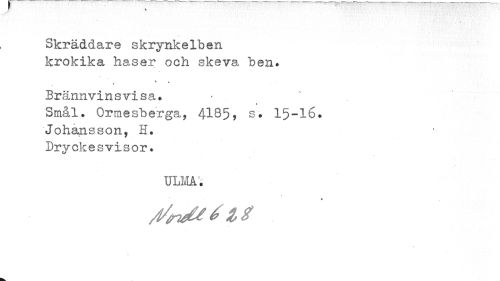 //// i ¦ V' ¦•¦ . « //// Skräddare skrynkelben krokika haser och skeva "ben. //// N » //// Brännvinsvisa. //// > //// Smål. Ormesberga, 4185) s• 15-16* //// Johansson, H. //// Dryckesvisor. //// ULMA. //// « //// /t/fr ////