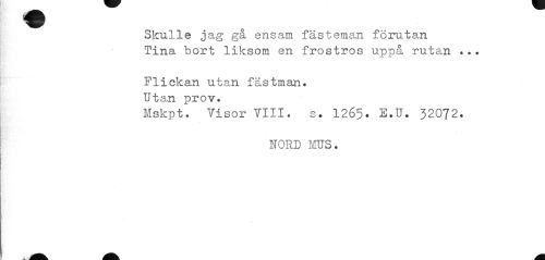 //// Skulle jag gå ensam fästeman förutan Tina "bort liksom en frostros uppå rutan * . . //// Flickan utan fästman. Utan prov. //// Mskpt. Visor VIII. s. 1265- E.U. 32072. //// NORD MUS. ////