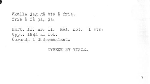 //// Skulle jag gå sta å fria, fria å få ja, ja. //// Haft. II. nr. 11. Mel. not. 1 str. //// Uppt. 1844 af Dbk. //// Sorunda i Södermanland. //// > //// DYBECK SV VISOR. //// T ////