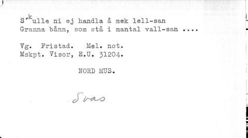 //// k . il S' ulle ni ej handla å mek lell-san //// Granna bånn. som stå i mantal vall-san ? //// Vg. Fristad. Mel. not. Mskpt. Visor, E.U. 31204. //// NORD MUS. i //// J U-O-sO [ //// = //// I ¦ //// | ////