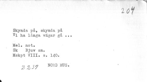 //// u //// Skynda på, skynda på Vi ha långa vägar gå ... //// Mel. not. Sk Bjuv sn. Mskpt VIII. s. 140. //// 2> % 7 nord mus. //// k ////