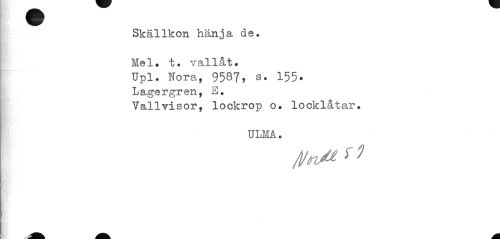 //// SkälIkon hänja de. Mel. t. vallåt. //// Upl. Nora, 958?, s. 155* //// Lagergren, E. //// Vallvisor, lockrop o. locklåtar. //// ULMA. //// fl/aM r ; ////