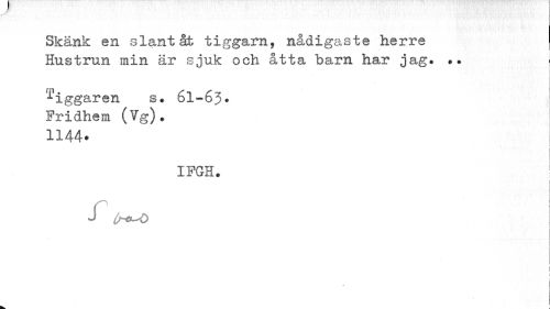 //// Skänk en slant åt tiggarn, nådigaste herre Hustrun min är sjuk och åtta barn har jag. •• //// 1'iggaren s. 6I-63. Fridhem (Vg). 1144. //// 1 //// IFGH. ! //// J //// i ////