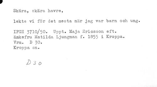 //// Skära, skära havre, //// lekte vi för det mesta när jag var barn och ung. //// IFGH 3710/50. Uppt. Maja Ericsson eft. änkefru Matilda, Ljungman f. 1855 i Kroppa. Vrm. D 50. //// Kroppa sn. //// D 3 o ////