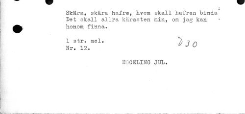 //// I * //// Skära, skära hafre, hrara skall hafren binda Det skall allra kärasten min, om jag kan honom finna. //// 1 str. mel. ^ , - //// Nr. 12. //// EGGELING JUL. ////