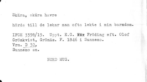 //// i //// Skära, skära havre //// i //// i i //// hörde till de lekar man ofta lekte i min barndom. ! //// IFGH 3398/19. Uppt. 3. G. Xäx Fröding eft. Olof Grönkvist, Grönas. F. 1846 i Sunnemo. Vrm. D 30^ Sunnemo sn. //// NORD MUS. ////