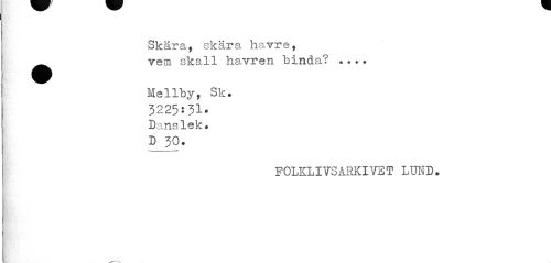 //// Skära, skära havre, ^^ veni skall havren binda? ... //// Mellby, Sk. //// 3225:31. //// Danslek. //// D 30. //// FOLKLIVSARKIVS T LUND. ////