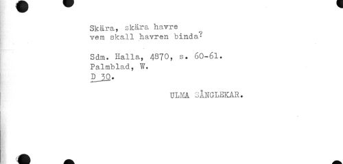 //// Skära, skära havre vem skall havren binda'-' //// Sdm. Hälla, 4870, s. 60-61. //// Palmblad, W. DJK). //// ULM SÅNGLEKAR. //// t //// A fk ////