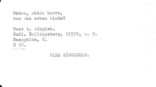 //// Skära, skära havre, vem ska neken binde? //// Text t. sånglek. //// Smålt Hallingeberg, 21578, s. 9* Haeggblom, C. //// D 30. //// ULMA SÅNGLEKAR. //// k ////