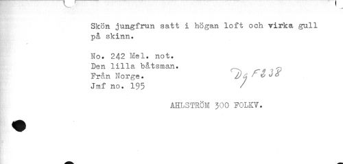 //// Skön jungfrun satt i högan loft och virka gull på skinn. //// No. 242 Mel. not. Den lilla båtsman. Från Norge. //// a, riZX //// Jmf no. 195 //// AHLSTRÖM 300 FOLKV. ////
