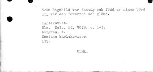 //// Skön Ragnhild var fattig och född av ringa börd uti världen föraktad och glömd* //// Kärleksvisa. //// Dis. Dals. Ed, 9078, s. 1-3. Löfgren, I. //// Enstaka kärleksvisor. //// 135. //// ULM. ////