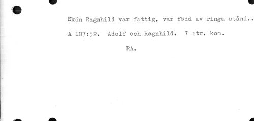 //// I I k fl B //// Skön Ragnhild var fattig, var född av ringa stånd.. A 107:52. Adolf och Ragnhild. 7 str. kom. //// RA. ////