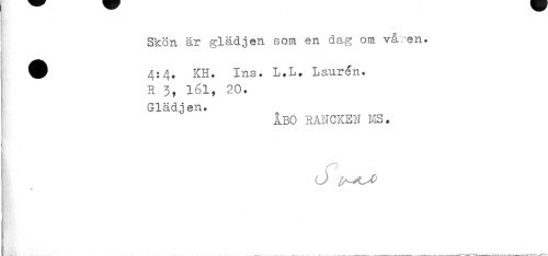 //// Skön är glädjen som en dag om våren. //// ^ 4:4. KH. Ins. L.L. Laurén. //// R 3, 161, 20. Glädjen. //// ÅBO RAHCKSU MS. //// O M^ ////