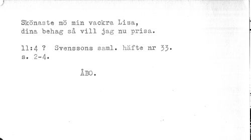 //// Skönaste mö min vackra Lisa, dina behag så vill jag nu prisa. //// 11:4 ? Svenssons saml. häfte nr 33* s. 2-4* //// ÅBO. //// b //// i //// l //// i //// i ////