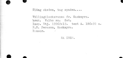 //// Släng skeden, tag spaden... //// Väl1ingk1ocksramsa fr. Mackmyr a. //// bruk:. Valbo sn. Gst. //// Insp. Rtj. 12062:12. text A. 186:22 a. //// P.N. Persson, Mackmyra. //// Ramsor. //// RA INSP. //// > ////