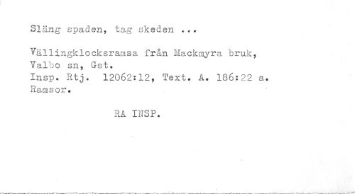 //// Släng spaden, tag skeden ... //// Vällingklocksramsa från Mackmyra bruk, Yalbo sn, Gst. //// Xnsp? Stj. 12062:12, Text. A. 186:22 a. Ramsor. //// RA I1TSP. //// ? ////