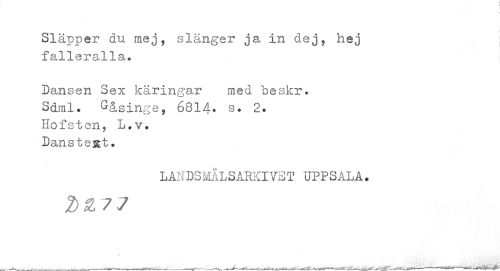 //// 1 //// Släpper du mej, slänger ja, in dej, hej fall @ 3?8, Ila» //// Dansen Sex käringar med "beskr. Sdml. &åsinge, 6814* s. 2. //// Hofsten, L.v. Danste&t. //// LAMDSMALSARKIVET UPPSALA. //// 2*77 ////
