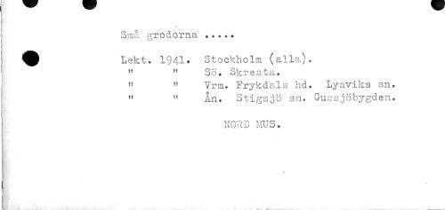 //// * //// Små grodorna ... //// Lekt. 1941* Stockholm (alla). //// tf n So. Skresta. //// u lf Vrm. Frykdals hd. Lysviks sn. //// M n An. Stigsjö sn. G-ussjöbygden. //// NORD MUS. //// t ////