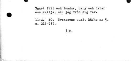 //// Snart fält och lundar, berg och dalar ^ oss skilja, när jag från dig far. //// 11:4* BO. Svenssons saml. häfte nr 5» //// s. 218-219* //// ÅBO. ////