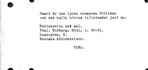 //// Snart är den ljuva sommaren förliden och den kalla hösten tillstundar just nu. //// Kärleksvisa med mel. //// Vsml. Horberg, 8044, s. 90-91» Lagergren, E. - //// Enstaka kärleksvisor. //// ULMA. ////