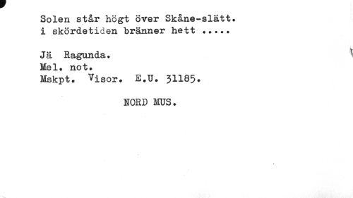 //// Solen står högt över Skåne-slätt, i skördetiden bränner hett ... //// Jä Ragunda. \ //// Mel. not. //// Mskpt. Visor. E.U. 31185» //// HORD MUS. //// % ////