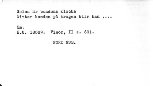 //// Solen är bondens klocka //// Sitter bonden på krogen blir han ... //// « //// Sm. //// E.U. 18089. Visor, II s. 691. //// HORD MUS. //// b. ' ////