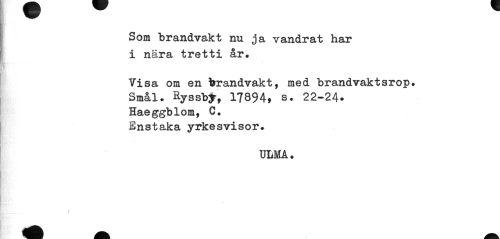 //// Som brandvakt nu ja vandrat har i nära tretti år. //// Visa om en brandvakt, med brandvaktsrop. //// Smål. Ryssbfr, 17894t s. 22-24* //// Haeggblom, G. Enstaka yrkesvisor. //// ULMA. //// i ////
