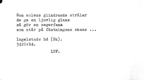 //// Som solens glindrande strålar //// de ge en ljuvlig glans //// så gör en segerfana //// som står på fästningens skans *•. //// Ingelstads hd (Sk). //// 3420:84. //// LUF. ////