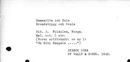 //// * //// Sommerlöw och Sale Brandetrygg och Svale //// Sid. 2. Poldalen, Norge. Mel. not. 2 str. (Norsk artförändr. av nr 1: "Du Hihi Hangela...**) //// ® DYBECK RUNA //// SV VALLV & HORNL. I846. //// M ////