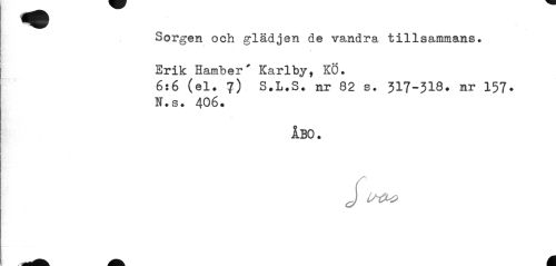 //// Sorgen och glädjen de vandra tillsammans. Erik Hamber' Karlby, KÖ. //// 6:6 (el. 7) S.L.S. nr 82 s. 317-318. nr 157. //// N.s. 406. //// åbo. //// J //// ^ Ä M ////