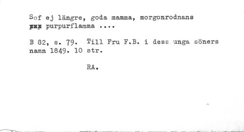 //// 4 //// Sof ej längre, goda mamma, morgonrodnans jBKjs purpurflamma ? •. • //// B 82, s. 79* Till Fru F.B. i dess unga söners namn 1849* 10 str. //// RA» ////