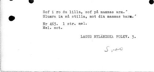 //// Sof i ro du lilla, sof på mammas arm. ' ^^ Slumra in så stilla, mot din mammas bara. " //// Hr 463. 1 str. mel. Mel. not. //// LÅGUS HYLÄIDSKå FOLKV. 3. //// S (A^ ////
