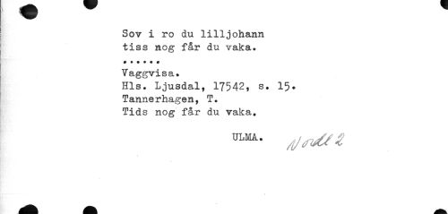 //// Sov i ro du lilljohann tiss nog får du vaka. //// Vaggvisa. //// Hls. Ljusdal, 17542, s. 15. //// Tannerhagen, T. Tids nog får du vaka. ////
