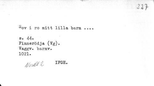 //// 21} //// 4 //// ^ov i ro mitt lilla barn ... s. 44* //// Finnerödja (Vg). Vaggv. barnv. 1021. //// 4/^t IFGH- ////