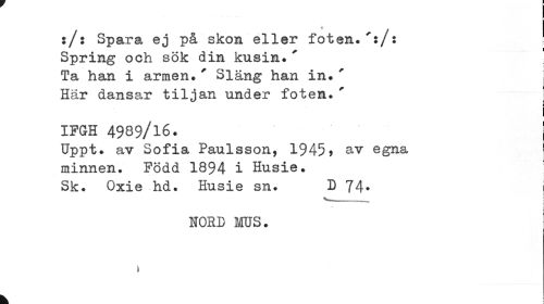 //// :/: Spara ej på skon eller foten.':/: Spring och sök din kusin.' Ta han i armen.' Släng han in.' Här dansar tiljan under foten. ' //// i I //// IFGH 4989/l6. //// Uppt. av Sofia Paulsson, 1945 > av egna ' //// minnen. Född 1894 i Husie. //// Sk. Oxie hd. Husie sn. D 74- I //// • i //// NORD MUS. ; //// k ////