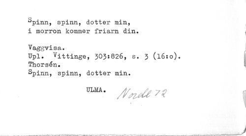 //// Spinn, spinn dotter min, //// i morgon kommer friarn din ??•. //// Vaggvisa. //// Upl. ^"i 11 inge, 303:826, s. 3 (l6:o). Thorsen. //// Spinn, spinn, dotter min. //// BLMA- /M 7t I //// J //// ___---.---.v-----•---- ---___rf___-------- ////
