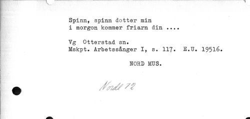 //// Spinn, spinn dotter min //// i morgon kommer friarn din ... //// Yg Otterstad sn. //// Mskpt. Arbetssånger I, s. 117. E.U. 19516. //// HORD MUS. //// 0 ////