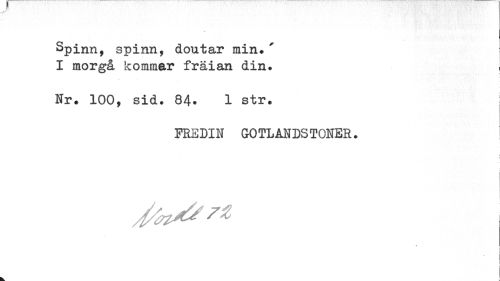 //// Spinn, spinn, doutar min.' //// I morgå kommar fräian din. j //// Nr. 100, sid. 84. 1 str. //// PREDIN GOTLANDSTONER. //// i ////