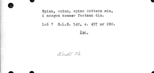 //// Spinn, spinn, spinn dottern min, //// i morgon kommer festman din. //// 1:6 ? S.L.S. 542, s. 497 nr 280. //// ÅBO. //// /l/si^ 7Z ////