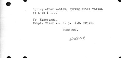 //// A Bl //// Spring efter vatten, spring efter vatten //// ös i ös i •. • • //// Vg Korsberga. //// Mskpt. Visor VI. s. 5. E.U. 22572. //// NORD MUS. ////