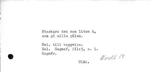 //// ¦s //// Stackars den som liten ä, som gå milla gålan. //// Mel» till vaggvisa. Dal. Gagnef, 211:3, s. 1. //// • Gasner" ^ W //// ULMå. ////