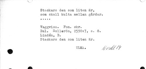 //// Stackars den som liten är, //// som skall kulta mellan gårdar. *• • * ? //// Vaggvisa. Fon. skr. //// Dal. Sollerön, 2590:7, s. 8. //// Linden, B. //// Stackars den som liten är. //// ^ ULM. sj/s^ft /jf ////