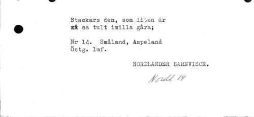 //// Stackars den, som liten är så sa tult imilla gåra; //// Nr 14* Småland, Åspeland Östg. Imf• //// NORDLANDER BARNVISOR. ////