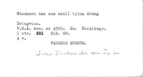//// Stackars den som skall tjäna dräng Drängvisa» //// V.M.A. Åcc. nr 4389* Sn. Harplinge. 1 str* 3PX Sid. 88. 4 v. //// takberg museum. ////