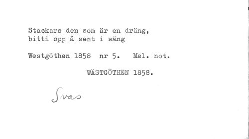 //// i //// Stackars den som är en dräng, "bitti opp å sent i säng //// Westgöthen 1858 nr 5* Mel. not. //// WlSTGÖTHEU 1858. j //// J VtZsO j //// j ////