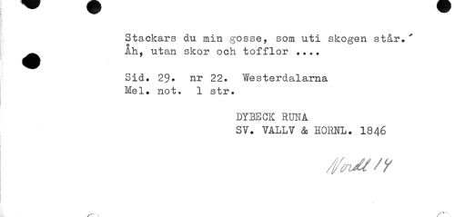 //// Stackars du min gosse, som uti skogen står.' ^^ Ah, utan skor och tofflor ... //// Sid. 29. nr 22. Westerdalarna //// Mel. not. 1 str. //// DYBECK ROTA //// SV. VALLV & HORNL. I846 //// /(/criM/y //// I //// ___ ////