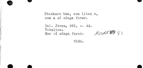 //// Stackars han, som liten e, som a så månge farer. //// Dal. Järna, 266, s. 44* Borelius* //// Har så många far ar. /^ulf //// ulmå. //// B B m Bk B B ////