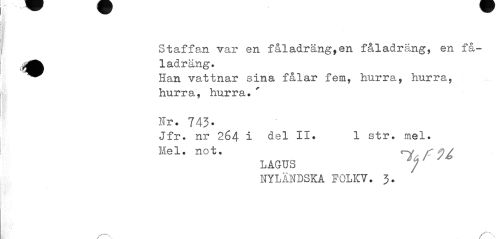 //// Staffan var en fåladräng,en fåladräng, en få-1 adr äng. //// Han vattnar sina fålar fem, hurra, hurra, hurra, hurra.' //// Hr. 743- //// Jfr. nr 264 i del II. 1 str. mel. //// Mel. not. ry //// LÅGTTS /" //// NYLÅHDSKÅ FOLKY. 3. ////